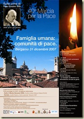 “Famiglia umana: comunità di pace” è il titolo della 40ª Marcia per la pace che si terrà a Bergamo il 31 dicembre 2007. Si svolgerà a Sotto il Monte Giovanni XIII e a Seriate. Sarà l’occasione per celebrare il 2008 come anno giovanneo.