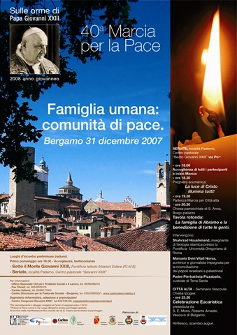 “Famiglia umana: comunità di pace” è il titolo della 40ª Marcia per la pace che si terrà a Bergamo il 31 dicembre 2007. Si svolgerà a Sotto il Monte Giovanni XIII e a Seriate. Sarà l’occasione per celebrare il 2008 come anno giovanneo.