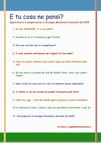 p.s.: in occasione della prossima GMG di Sydney, il Movimento Giovanile Missionario, la Pastorale Giovanile Nazionale e la Pontificia Unione Missionaria hanno ideato dall'1 al 22 luglio 2008, un'esperienza missionaria nelle Filippine seguita dal gemellaggio a Melbourne e poi a Sydney. Il costo è di 1700 Euro comprensivo di un aiuto CEI; per informazioni mgm@operemissionarie.it