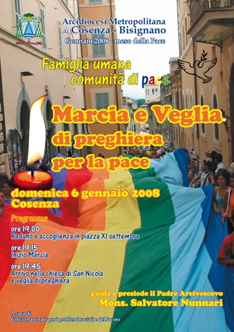 Nell'augurarvi buone feste, vi ricordo che giorno 06 gennaio 2008 alle ore 19,00 si terra qui a Cosenza la "Marcia e Veglia della Pace". E' gradita la vostra presenza, insieme alla vostra comunità parrocchiale e i gruppi presenti nella parrocchia. La nostra testimonianza è efficace se portiamo ciscun gruppo stendardi o striscioni. Certo di una vostra presenza vi saluto.